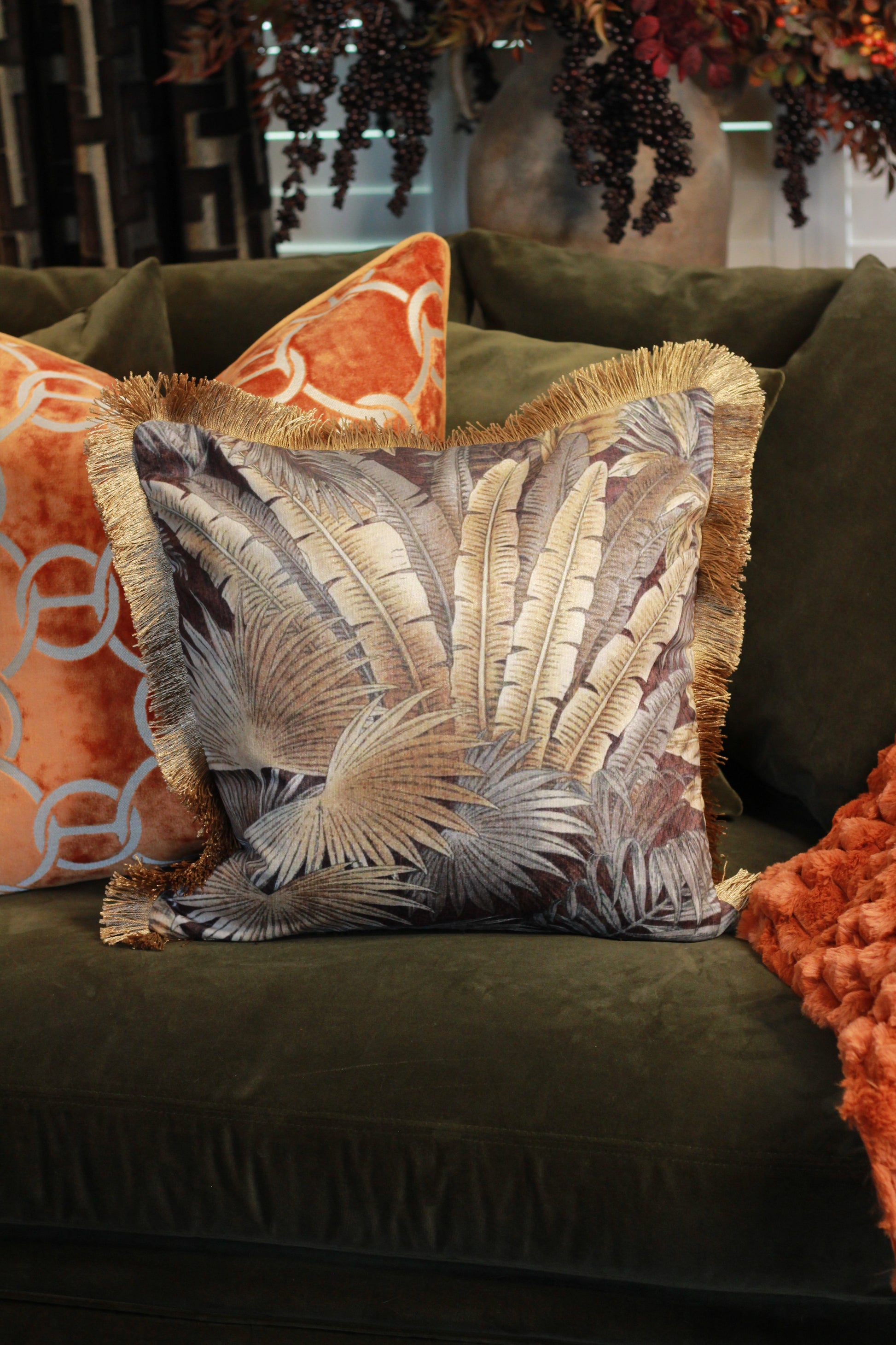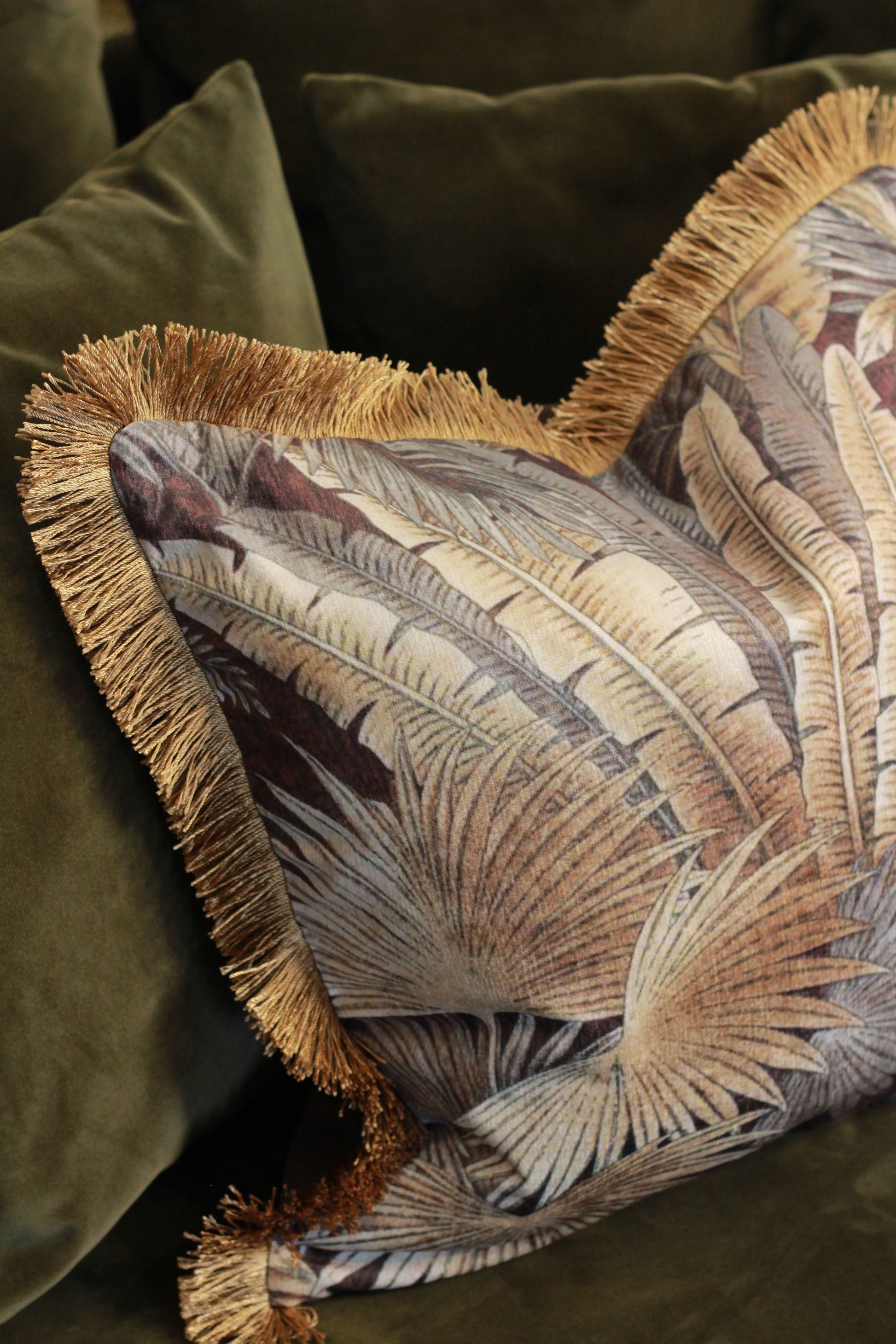 Bring a touch of statement luxury to your space with this striking palm print cushion. Rich earthy tones are layered with golden highlights, finished with a soft fringed edge for added texture and depth.