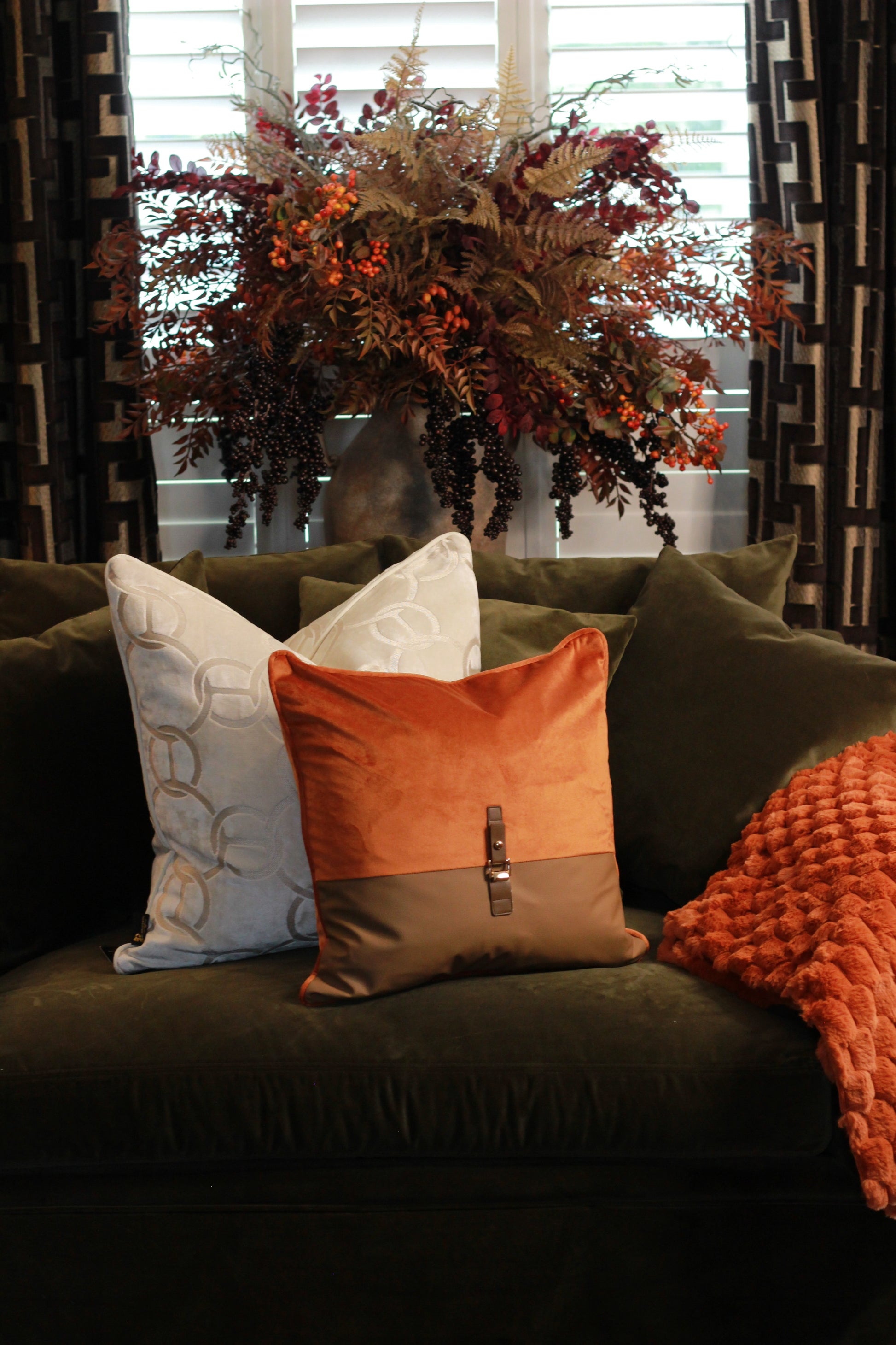 Bold yet sophisticated, this two-tone cushion brings warmth and modern style to your space. The rich orange velvet-effect fabric is paired with a smooth faux-leather panel, finished with a central buckle detail for a striking, tailored look.