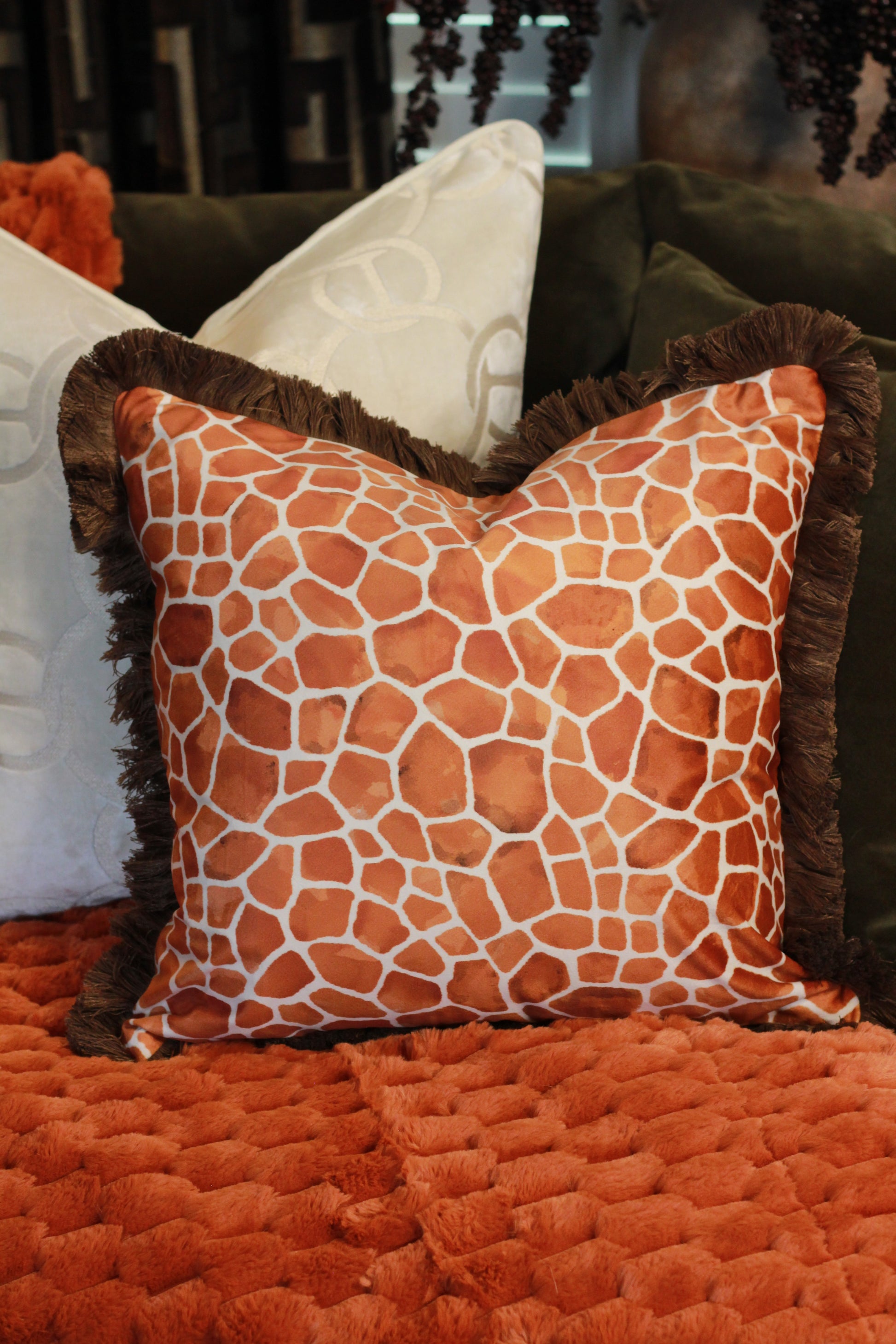 Fringed Orange Giraffe Print Cushion